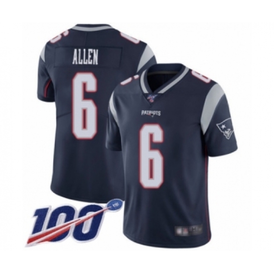 >Men's New England Patriots #6 Ryan Allen Navy Blue Team Color Vapor Untouchable Limited Player 100th Season Football Jersey