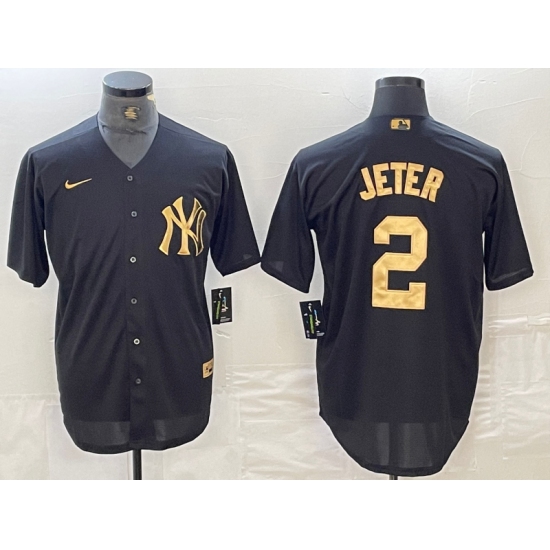 Men's New York Yankees #2 Derek Jeter Black Gold Cool Base Stitched Jersey
