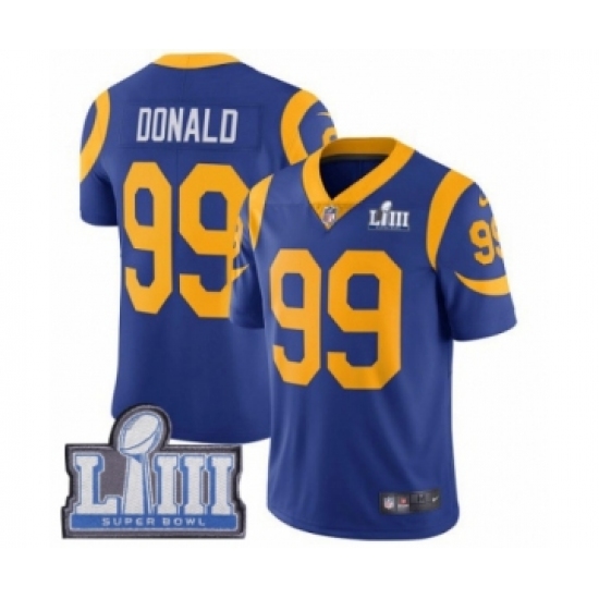 >Men's Nike Los Angeles Rams #99 Aaron Donald Royal Blue Alternate Vapor Untouchable Limited Player Super Bowl LIII Bound NFL Jersey