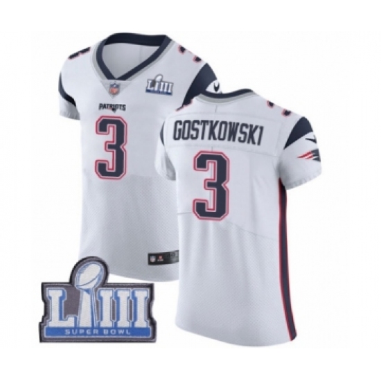 >Men's Nike New England Patriots #3 Stephen Gostkowski White Vapor Untouchable Elite Player Super Bowl LIII Bound NFL Jersey