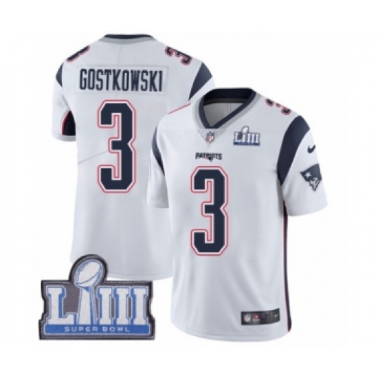 >Men's Nike New England Patriots #3 Stephen Gostkowski White Vapor Untouchable Limited Player Super Bowl LIII Bound NFL Jersey