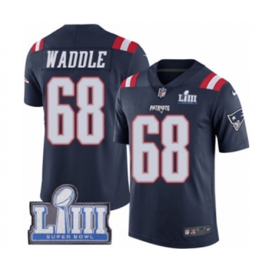 Men's Nike New England Patriots #68 LaAdrian Waddle Limited Navy Blue Rush Vapor Untouchable Super Bowl LIII Bound NFL Jersey