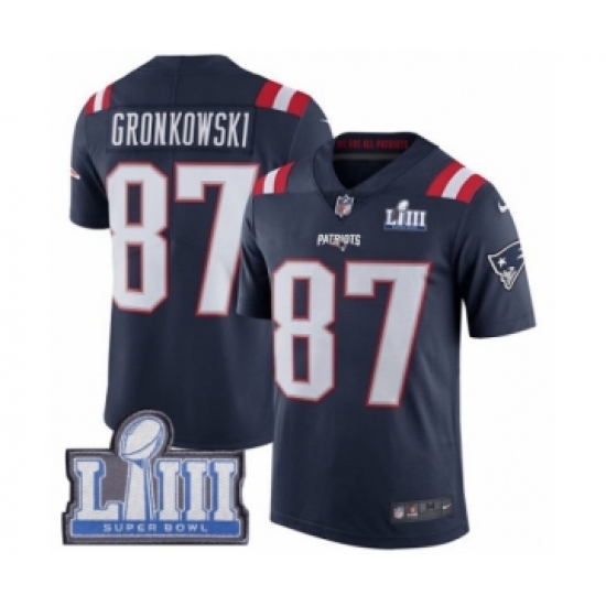>Men's Nike New England Patriots #87 Rob Gronkowski Limited Navy Blue Rush Vapor Untouchable Super Bowl LIII Bound NFL Jersey