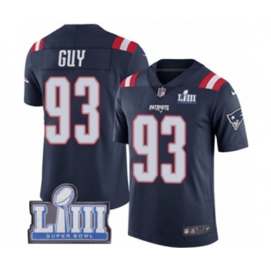 >Men's Nike New England Patriots #93 Lawrence Guy Limited Navy Blue Rush Vapor Untouchable Super Bowl LIII Bound NFL Jersey