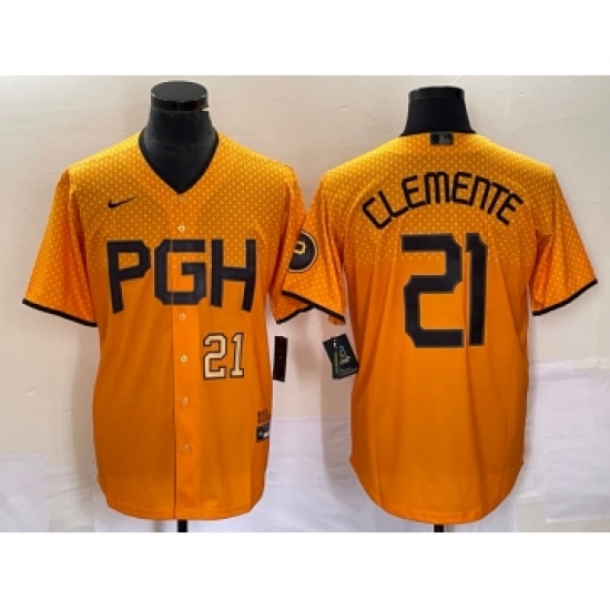 >Men's Nike Pittsburgh Pirates #21 Roberto Clemente Number Gold 2023 City Connect Stitched Jersey2