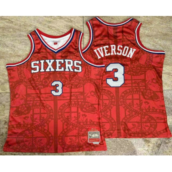 Men's Philadelphia 76ers #3 Allen Iverson Red Snakeskin Hardwood AU Throwback Jersey