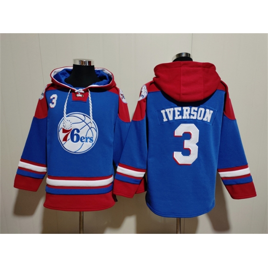 >Men's Philadelphia 76ers #3 Allen Iverson Royal Red Lace-Up Pullover Hoodie