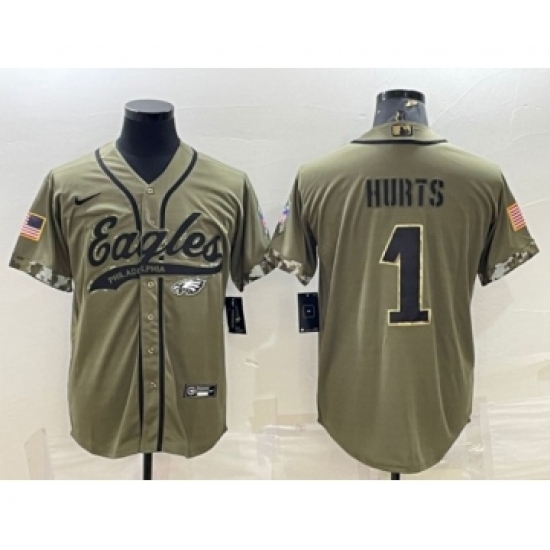 >Men's Philadelphia Eagles #1 Jalen Hurts Olive 2022 Salute To Service Cool Base Stitched Baseball Jersey
