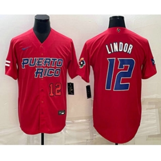 >Men's Puerto Rico Baseball #12 Francisco Lindor Number 2023 Red World Baseball Classic Stitched Jersey