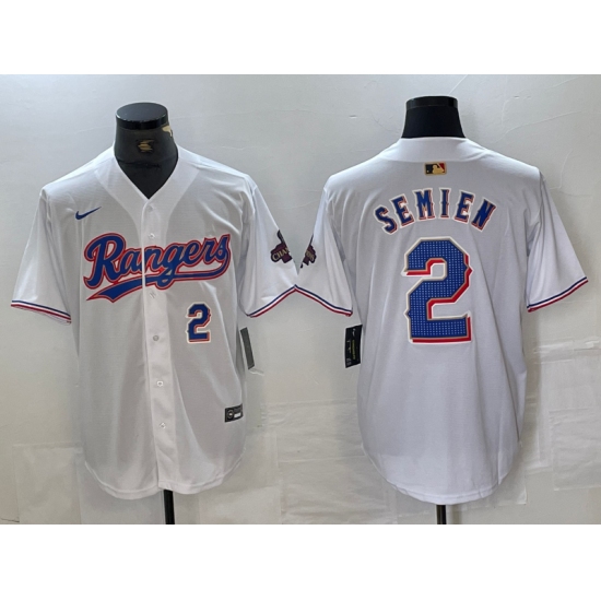 Men's Texas Rangers #2 Marcus Semien 2023 White World Series Stitched Baseball Jersey