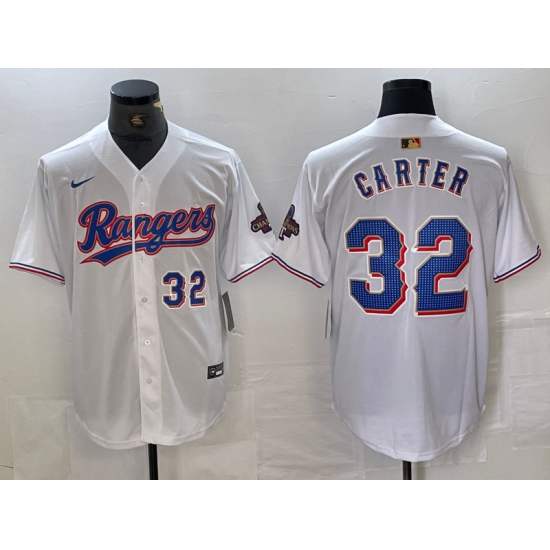 Men's Texas Rangers #32 Evan Carter White 2023 World Series Champions Cool Base Jersey
