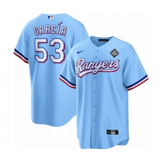 >Men's Texas Rangers #53 Adolis García Blue 2023 World Series Cool Base Stitched Baseball Jersey