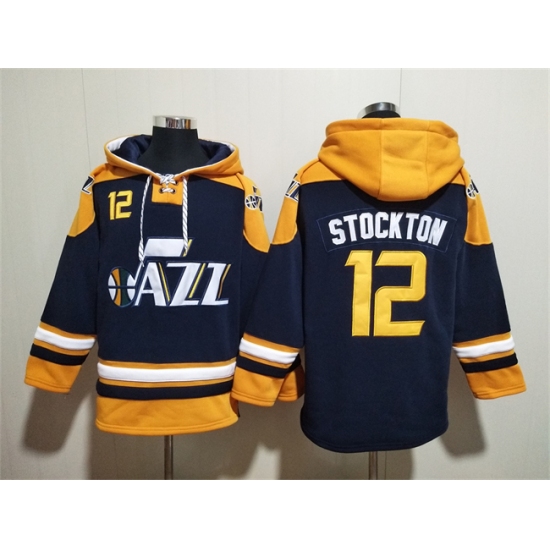 >Men's Utah Jazz #12 John Stockton Navy Yellow Lace-Up Pullover Hoodie
