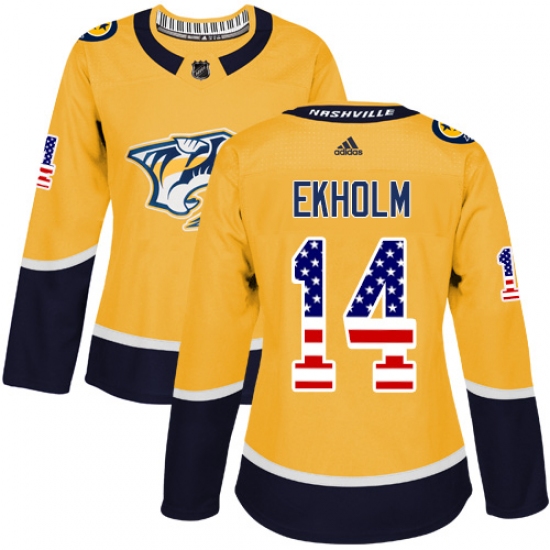 Home>NHL>Nashville Predators>Mattias Ekholm>Women's Adidas Nashville Predators #14 Mattias Ekholm Authentic Gold USA Flag Fashion NHL Jersey