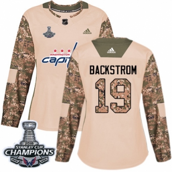 >Women's Adidas Washington Capitals #19 Nicklas Backstrom Authentic Camo Veterans Day Practice 2018 Stanley Cup Final Champions NHL Jersey