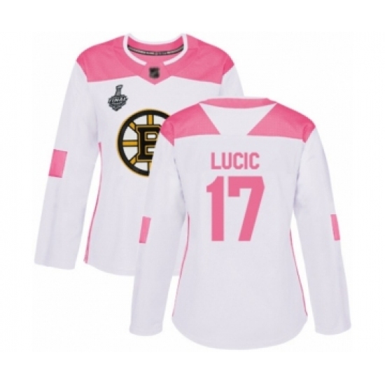 Women's Boston Bruins #17 Milan Lucic Authentic White Pink Fashion 2019 Stanley Cup Final Bound Hockey Jersey