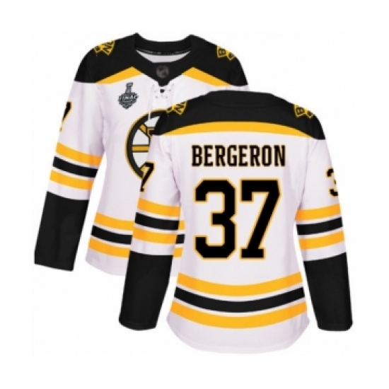>Women's Boston Bruins #37 Patrice Bergeron Authentic White Away 2019 Stanley Cup Final Bound Hockey Jersey