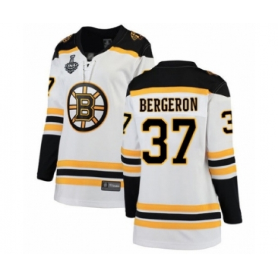 >Women's Boston Bruins #37 Patrice Bergeron Authentic White Away Fanatics Branded Breakaway 2019 Stanley Cup Final Bound Hockey Jersey
