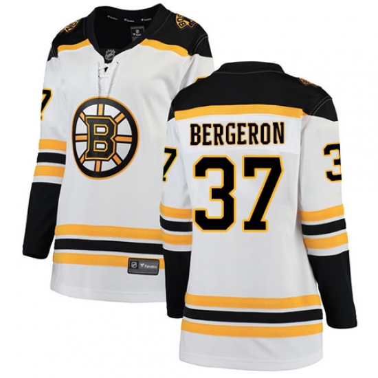 Women's Boston Bruins #37 Patrice Bergeron Authentic White Away Fanatics Branded Breakaway NHL Jersey