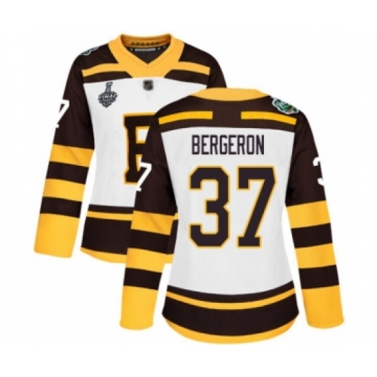 Women's Boston Bruins #37 Patrice Bergeron Authentic White Winter Classic 2019 Stanley Cup Final Bound Hockey Jersey