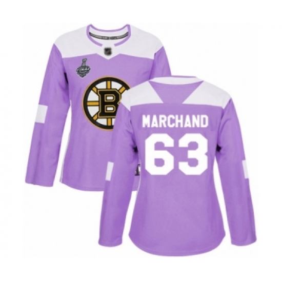 >Women's Boston Bruins #63 Brad Marchand Authentic Purple Fights Cancer Practice 2019 Stanley Cup Final Bound Hockey Jersey