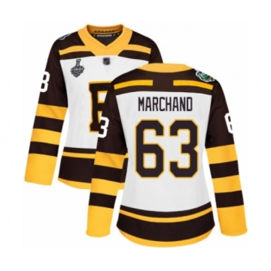 >Women's Boston Bruins #63 Brad Marchand Authentic White Winter Classic 2019 Stanley Cup Final Bound Hockey Jersey
