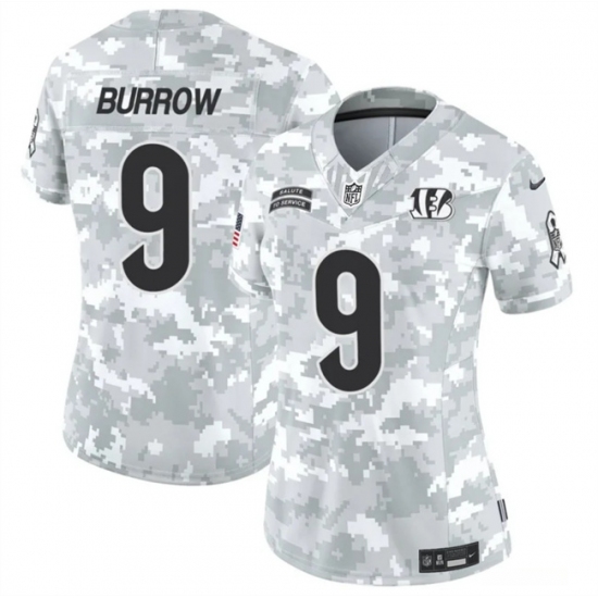>Women's Cincinnati Bengals #9 Joe Burrow 2024 F.U.S.E Arctic Camo Salute To Service Limited Stitched Football Jersey(Run Small)