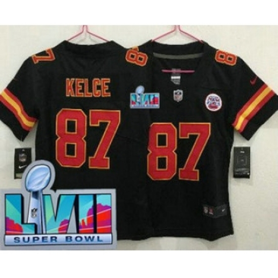 >Women's Kansas City Chiefs #87 Travis Kelce Limited Black Super Bowl LVII Vapor Jersey