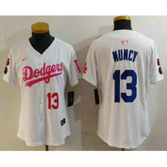 >Women's Los Angeles Dodgers #13 Max Muncy Number White Pink With Limited Stitched Jersey