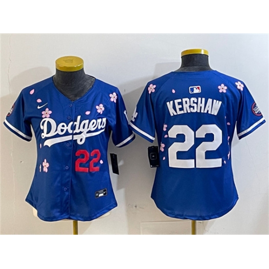 >Women's Los Angeles Dodgers #22 Clayton Kershaw Royal 2025 Tokyo Series Limited Stitched Baseball Jersey(Run Small)