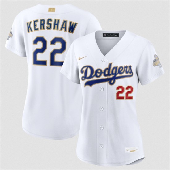 >Women's Los Angeles Dodgers #22 Clayton Kershaw White 2026 Gold Collection Stadium Stitched Baseball Jersey(Run Small)
