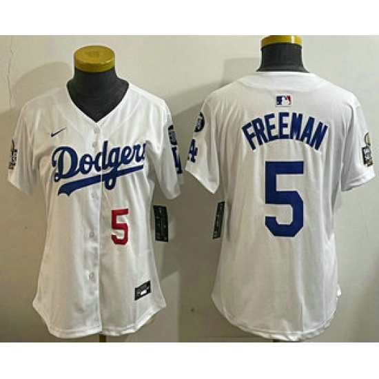 >Women's Los Angeles Dodgers #5 Freddie Freeman Number White 2024 World Series With Fernando 34 Limited Stitched Jersey
