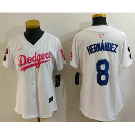 >Women's Los Angeles Dodgers #8 Kike Hernandez White Pink With Limited Stitched Jersey