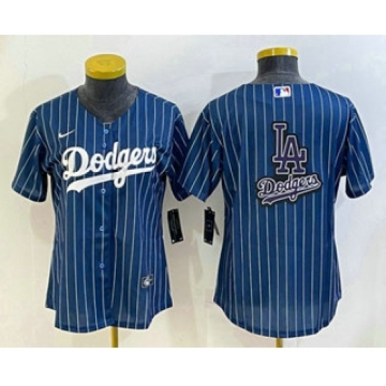 >Women's Los Angeles Dodgers Big Logo Navy Blue Pinstripe Stitched MLB Cool Base Nike Jerseys