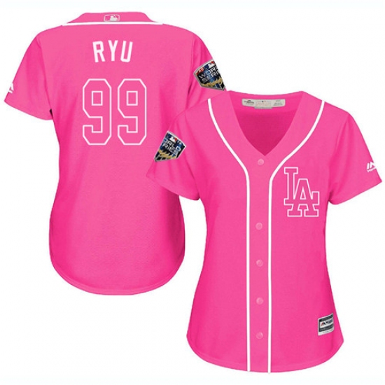 Women's Majestic Los Angeles Dodgers #99 Hyun-Jin Ryu Authentic Pink Fashion Cool Base 2018 World Series MLB Jersey