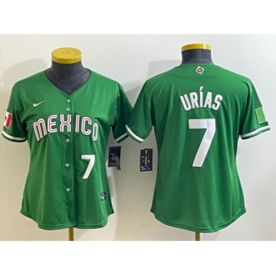 Women's Mexico Baseball #7 Julio Urias Number 2023 Green World Classic Stitched Jersey3