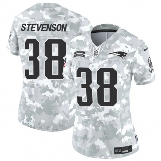 >Women's New England Patriots #38 Rhamondre Stevenson 2024 F.U.S.E Arctic Camo Salute To Service Limited Stitched Jersey(Run Small)