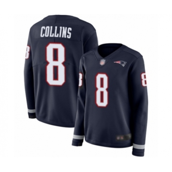 >Women's New England Patriots #8 Jamie Collins Limited Navy Blue Therma Long Sleeve Football Jersey