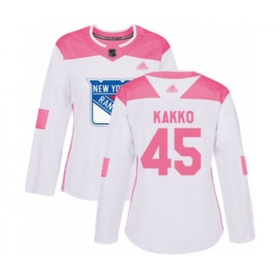 >Women's New York Rangers #45 Kaapo Kakko Authentic White Pink Fashion Hockey Jersey