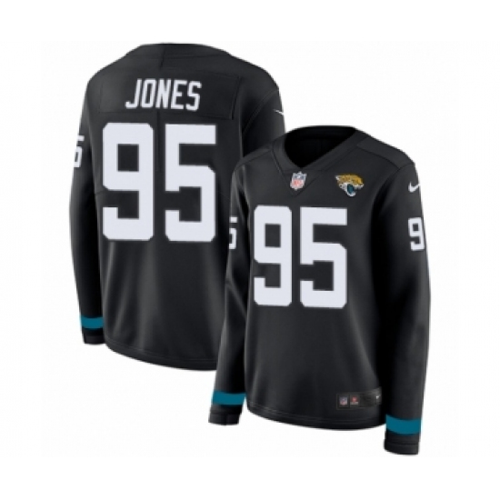 >Women's Nike Jacksonville Jaguars #95 Abry Jones Limited Black Therma Long Sleeve NFL Jersey