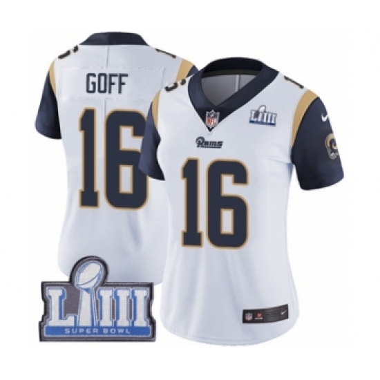 >Women's Nike Los Angeles Rams #16 Jared Goff White Vapor Untouchable Limited Player Super Bowl LIII Bound NFL Jersey