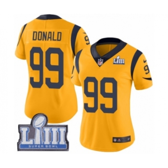 >Women's Nike Los Angeles Rams #99 Aaron Donald Limited Gold Rush Vapor Untouchable Super Bowl LIII Bound NFL Jersey
