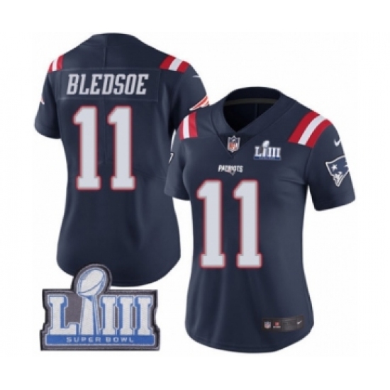 >Women's Nike New England Patriots #11 Drew Bledsoe Limited Navy Blue Rush Vapor Untouchable Super Bowl LIII Bound NFL Jersey