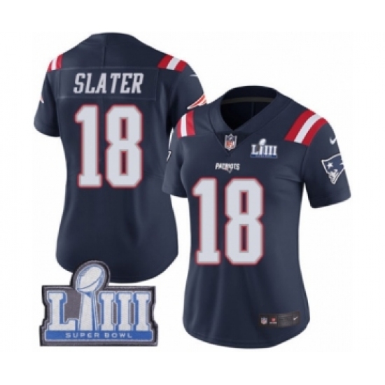 >Women's Nike New England Patriots #18 Matthew Slater Limited Navy Blue Rush Vapor Untouchable Super Bowl LIII Bound NFL Jersey