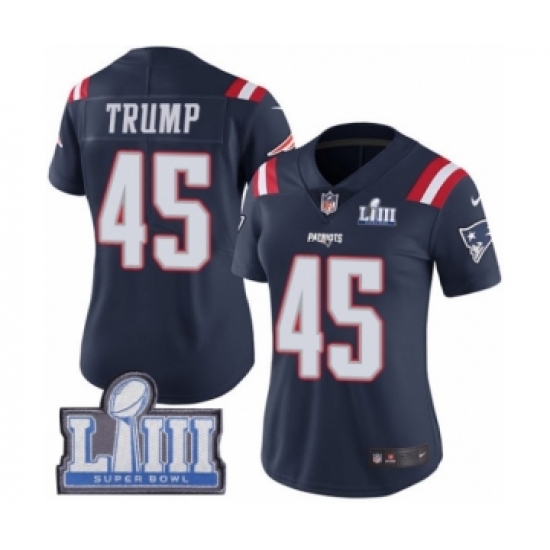>Women's Nike New England Patriots #45 Donald Trump Limited Navy Blue Rush Vapor Untouchable Super Bowl LIII Bound NFL Jersey