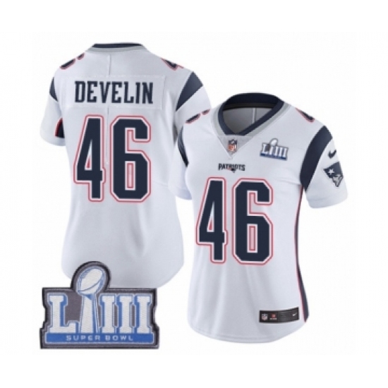 Women's Nike New England Patriots #46 James Develin White Vapor Untouchable Limited Player Super Bowl LIII Bound NFL Jersey