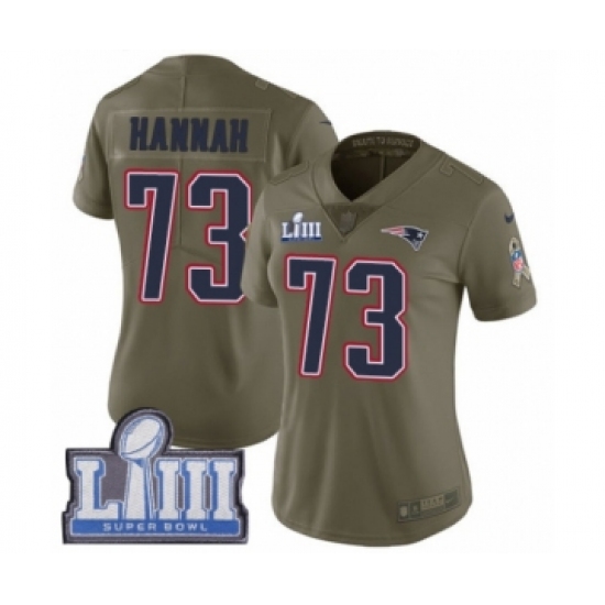>Women's Nike New England Patriots #73 John Hannah Limited Olive 2017 Salute to Service Super Bowl LIII Bound NFL Jersey