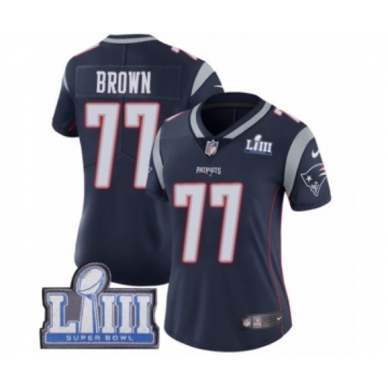 >Women's Nike New England Patriots #77 Trent Brown Navy Blue Team Color Vapor Untouchable Limited Player Super Bowl LIII Bound NFL Jersey
