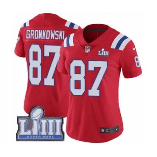 >Women's Nike New England Patriots #87 Rob Gronkowski Red Alternate Vapor Untouchable Limited Player Super Bowl LIII Bound NFL Jersey