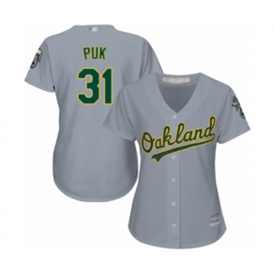 >Women's Oakland Athletics #31 A.J. Puk Authentic Grey Road Cool Base Baseball Player Jersey